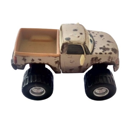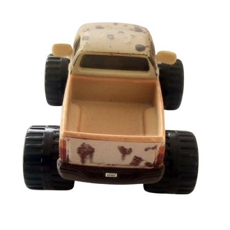 Ce modèle Deluxe Mattel capture son look sale beige/marron avec taches de boue, benne ouverte et pneus XXL.