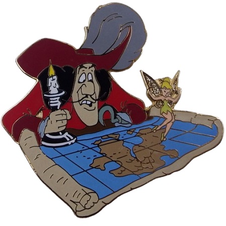 Le pin’s représente une scène marquante du film. Le Capitaine Crochet, vêtu de son manteau rouge, tient une bougie allumée dans une main. Il observe avec intensité une carte du Pays Imaginaire, posée devant lui. Clochette, quant à elle, marche directement sur la carte pour révéler la cachette de Peter Pan. Ses ailes brillent avec éclat, ce qui donne un effet scintillant très réussi.